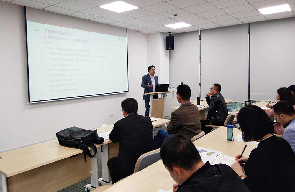 11月7日,來自全國各地的近二十位銷售經理在昆亞醫療總部進行托管業務知識及銷售技巧培訓。銷售中心邵總對在座的銷售經理進行講課,詳細介紹了昆亞醫療近年來在醫療設備整體服務托管方面取得的成果及經驗。